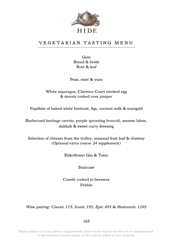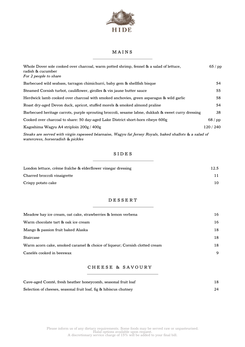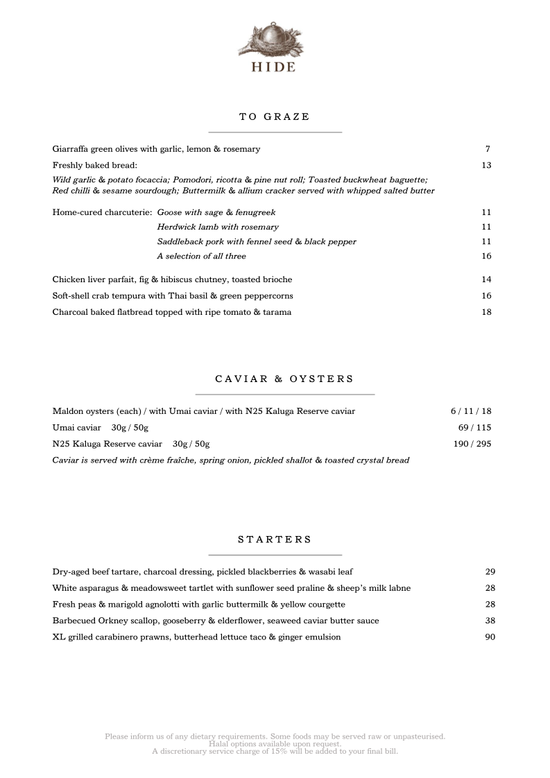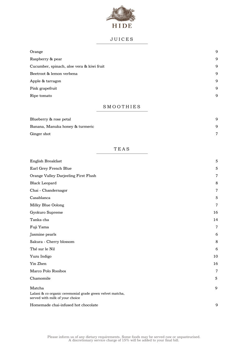 HIDE - London W1J 7NB Menu